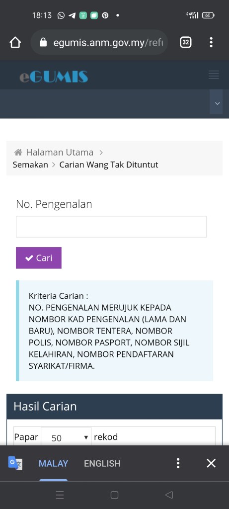 - Selepas anda berjaya masuk, anda perlu klik pada butang menu dan pilih semakan wang tidak dituntut atau klik butang berwarna ungu untuk carian wang tidak dituntut.