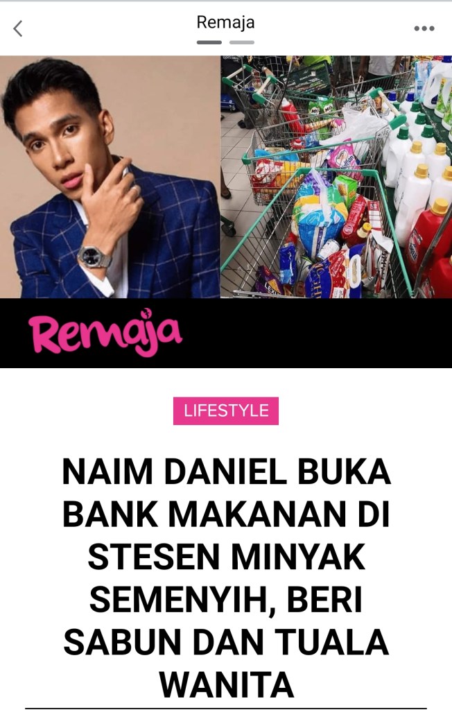 Contohnya artis muda Naim Daniel yang turut mengambil peluang menyampaikan sumbangan barangan sabun dan tuala wanita ini mendapat pujian ramai netizen yang mengakui barangan tersebut juga menjadi keperluan bagi golongan memerlukan selain barangan makanan.