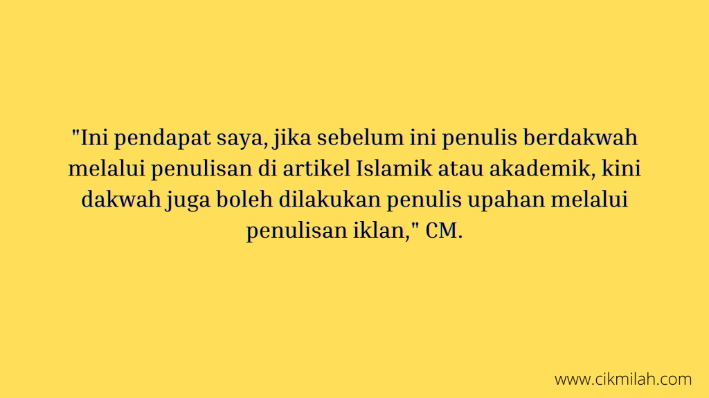 Ini pendapat saya, jika sebelum ini penulis berdakwah melalui penulisan di artikel Islamik atau akademik, kini dakwah juga boleh dilakukan penulis upahan melalui penulisan iklan.