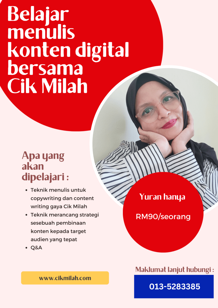 - Berkongsi ‘value’ mengenai bidang penulisan seperti content writing, copy writing, content creator, digital marketing dan yang berkaitan
